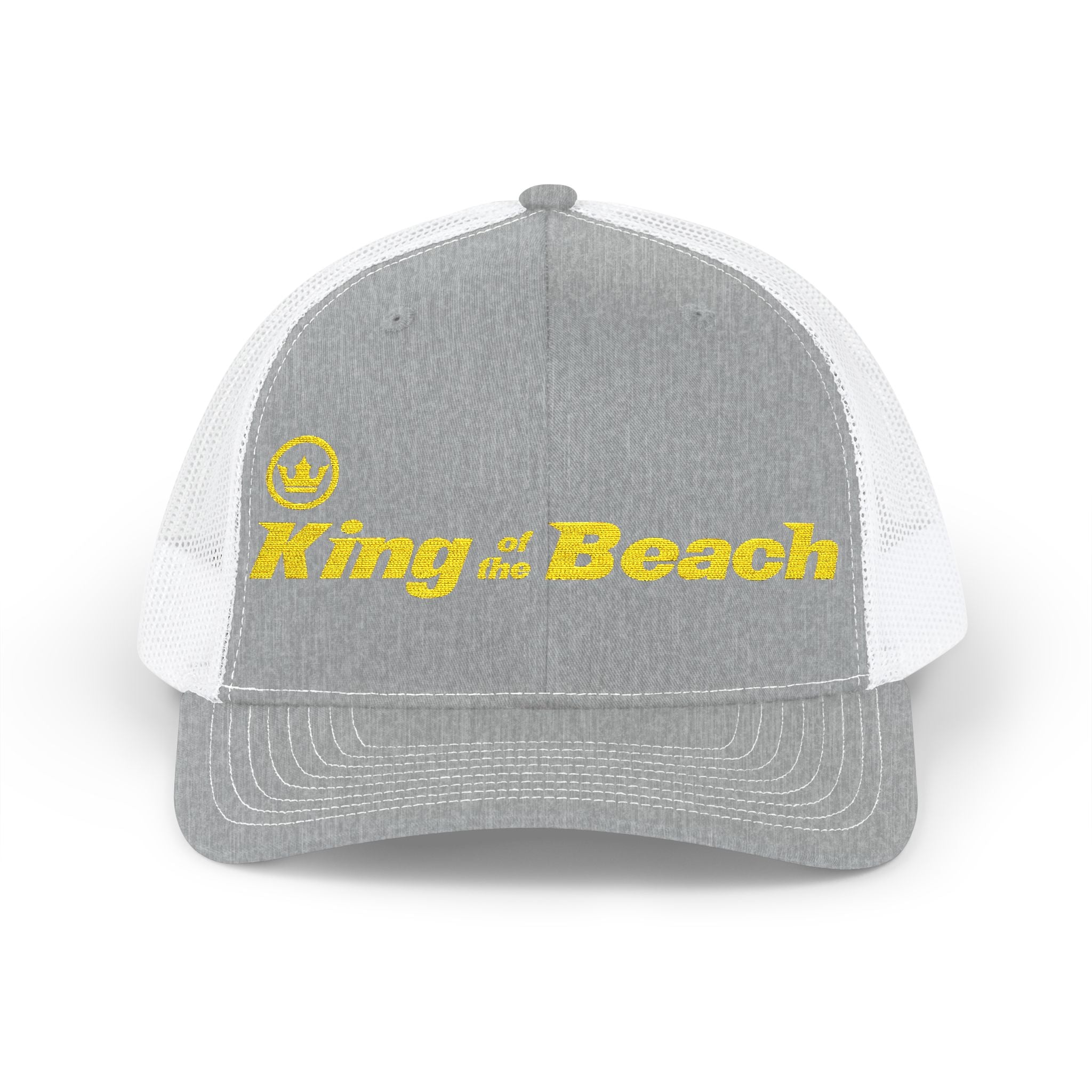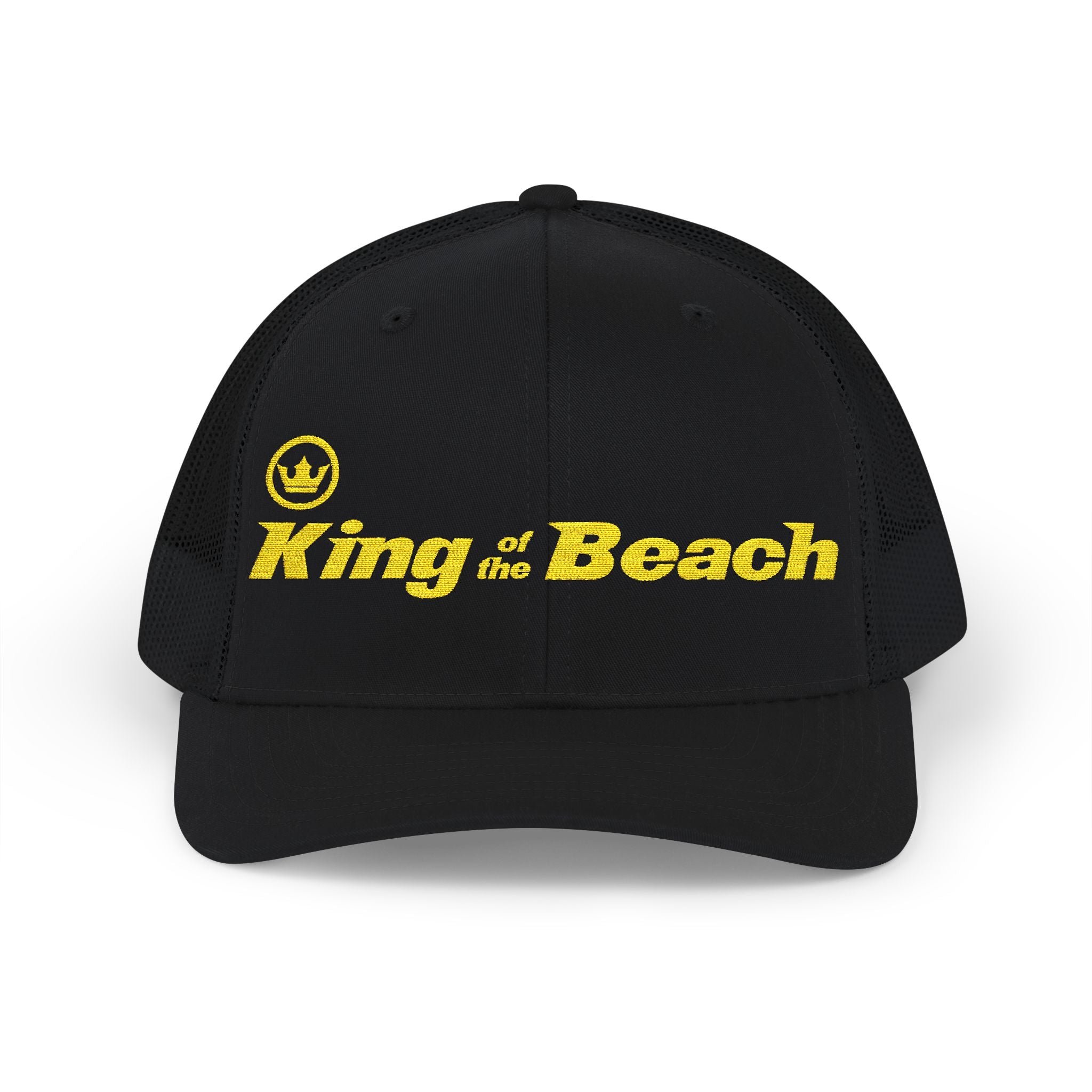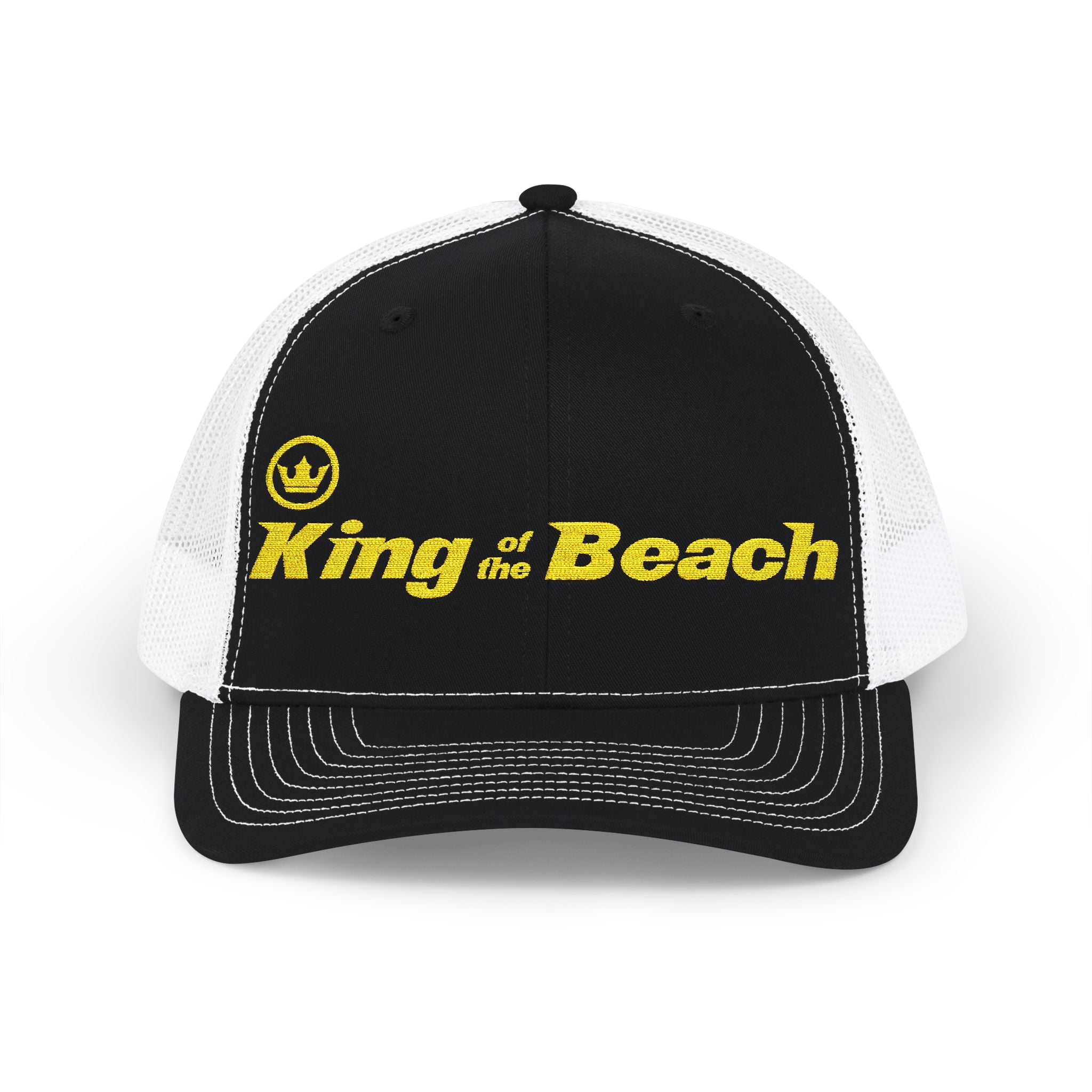 Our Signature King of the Beach® Crown Embroidered Snapback Trucker Hat by MIRAMAR® carries a sun-soaked vibe — bold yellow embroidery on a black front panel reads “King of the Beach,” framed by crisp white mesh. It sits mid-profile with a pre-curved visor and eight rows of stitching, giving it a classic, lived-in silhouette. The mesh back keeps things breezy on hot days, while the cotton sweatband and structured front keep comfort and shape through long beach afternoons. Adjustable snap closure lets it move from sunrise surf sessions to late-afternoon boardwalk hangs, and the subtle brand sticker on the visor nods to its casual authenticity. Wear it to anchor a laid-back summer outfit or to bring a little seaside swagger to everyday errands.